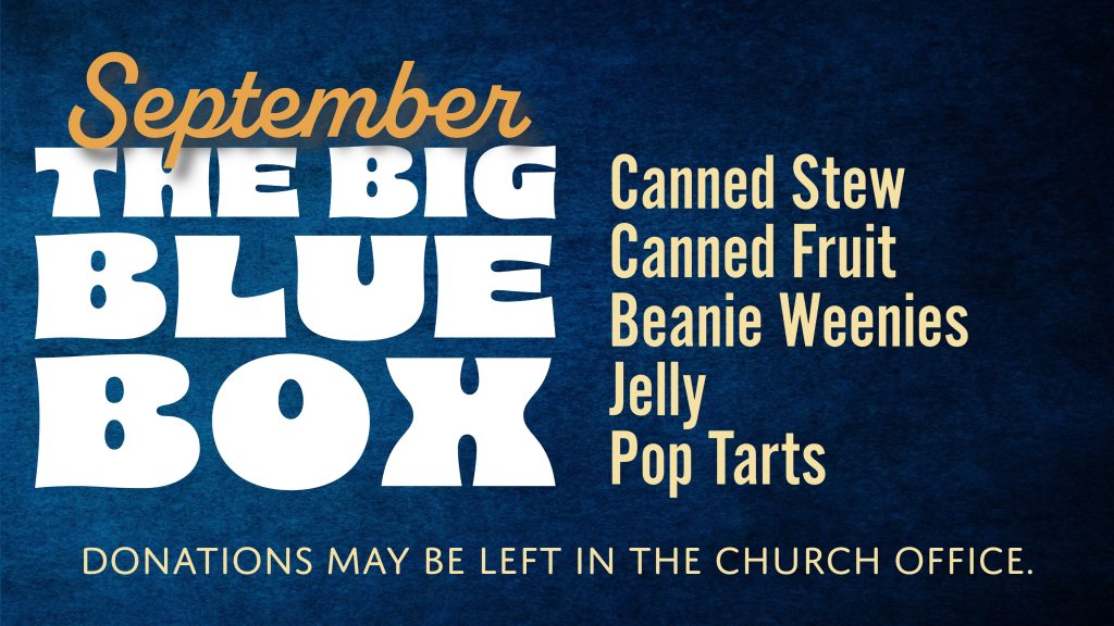 These items will be put in the Blessing Box. Just bring your items by the church office. And, if you can’t get to the store, you can make a donation and we’ll do the shopping. Thanks for all that you do!