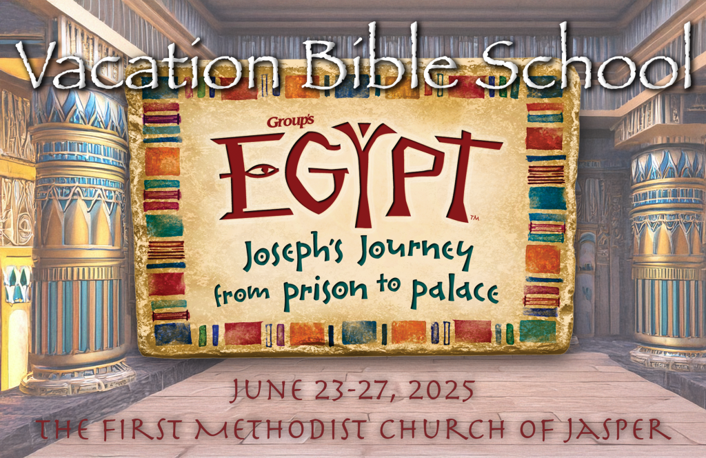 The First Methodist Church is happy to be able to bring Vacation Bible School to the Jasper community! Join us for an exciting Group™ VBS adventure, “Egypt: Joseph’s Journey from Prison to Palace.” We will begin each day in the Wesley Center at 9:00 am, and will conclude at noon (also in the Wesley Center).